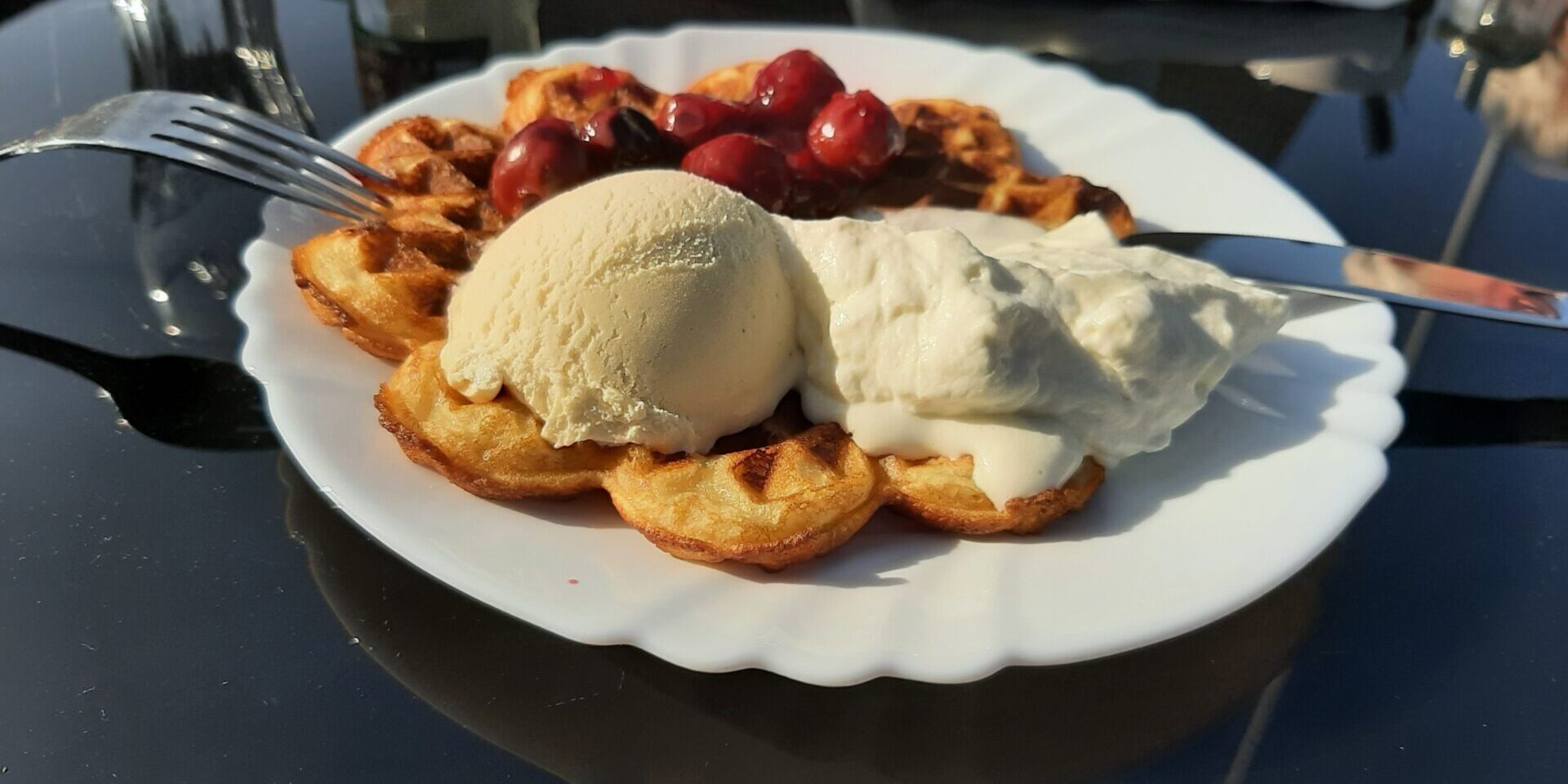 Pünktlich um 13.00 Uhr wurden die leckeren Waffeln von Simone und Michael Petri serviert. An diesem sonnigen, warmen Frühlingstag kam die Terrassengarnitur zum ersten Mal in diesem Jahr zum Einsatz. Fast jeder bestellte sich eine zweite Waffel als Nachschlag die mit Eis, Sahne und heißen Kirschen garniert waren. Zu den Wanderern kamen dann noch Vereinsmitglieder, die sich speziell nur für das Waffel essen angemeldet hatten.