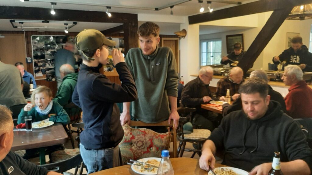 Die Temperaturen am Angelplatz waren typisch herbstlich kühl, bei bedecktem Himmel. Da war es gut, dass sich die Teilnehmer nach der Veranstaltung im Vereinsheim auf der gut beheizten Tenne mit einem warmen mittags Menü wieder aufwärmen und stärken konnten. Wer wollte konnte sich anschließend auch noch einen leckeren Nachtisch gönnen, der ebenfalls bereitgestellt war.